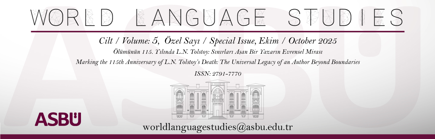 Duyurular 14 Şubat 2025 Yılı Özel Sayı Çağrısı: Ölümünün 115. Yılında L.N. Tolstoy: Sınırları Aşan Bir Yazarın Evrensel Mirası 14 Şubat World Language Studies 2025/1 (Haziran Sayısı) Makale Çağrısı 20 Aralık World Language Studies (WLS) 2024 Aralık Sayısı Makale Kabul Süreci Sona Ermiştir Haberler Tümü Kas 04 WLS 2025 Yılı Özel Sayısı: Ölümünün 115. Yılında L.N. Tolstoy: Sınırları Aşan Bir Yazarın Evrensel Mirası Haz 28 WLS 2025/1 Haziran Sayısı Ara 28 WLS 2024/2 Aralık Sayısı