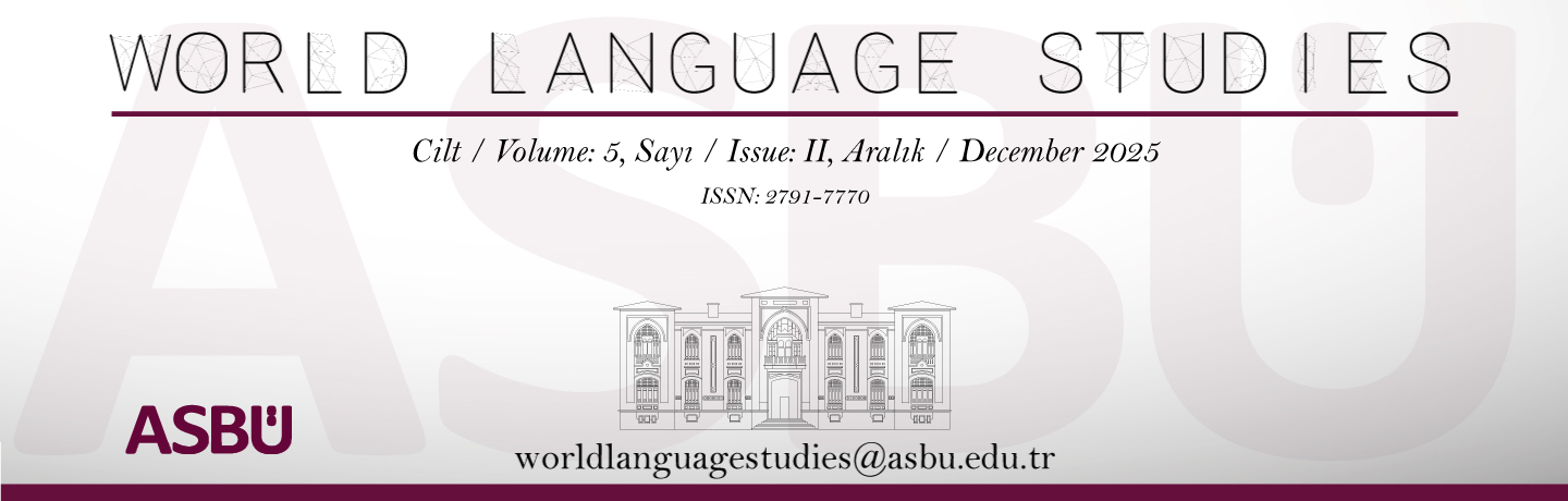 Duyurular 14 Şubat 2025 Yılı Özel Sayı Çağrısı: Ölümünün 115. Yılında L.N. Tolstoy: Sınırları Aşan Bir Yazarın Evrensel Mirası 14 Şubat World Language Studies 2025/1 (Haziran Sayısı) Makale Çağrısı 20 Aralık World Language Studies (WLS) 2024 Aralık Sayısı Makale Kabul Süreci Sona Ermiştir Haberler Tümü Ara 30 WLS 2025/2 Aralık Sayısı Kas 04 WLS 2025 Yılı Özel Sayısı: Ölümünün 115. Yılında L.N. Tolstoy: Sınırları Aşan Bir Yazarın Evrensel Mirası Haz 28 WLS 2025/1 Haziran Sayısı